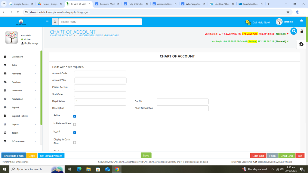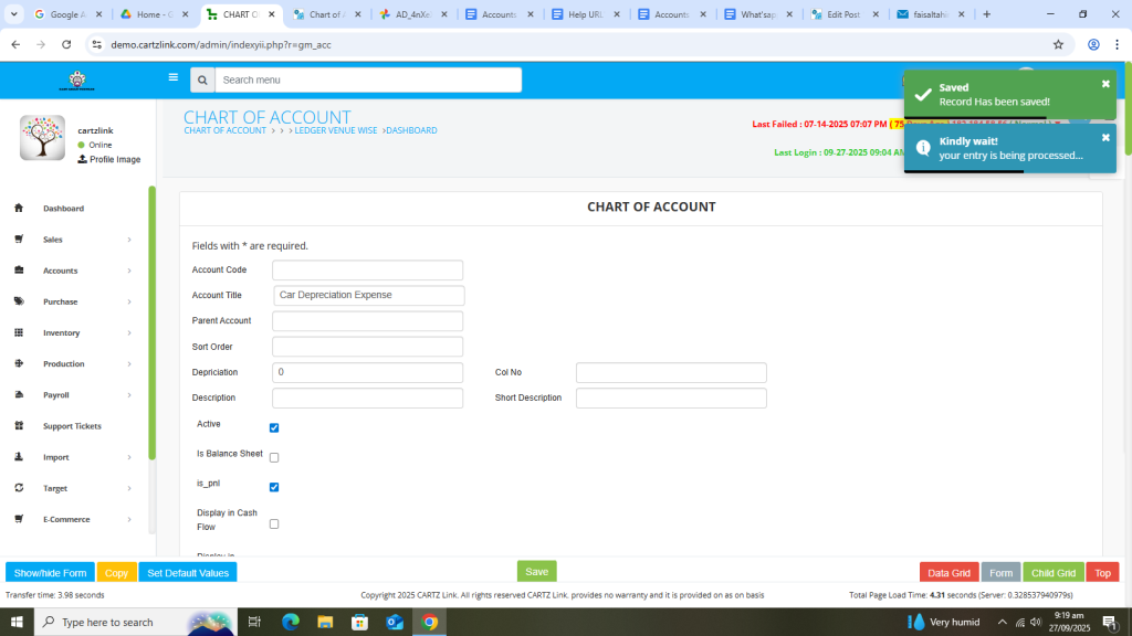Now input the required data such as Account Code, Account Title and Parent Account and then click on Green Save button at the bottom.