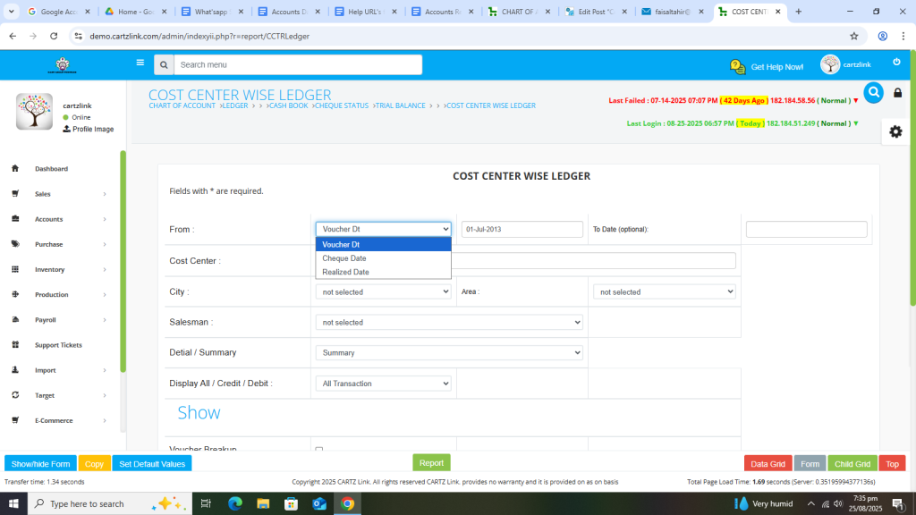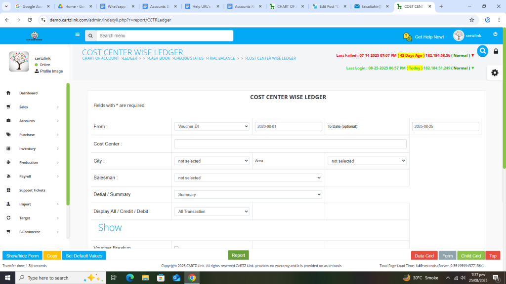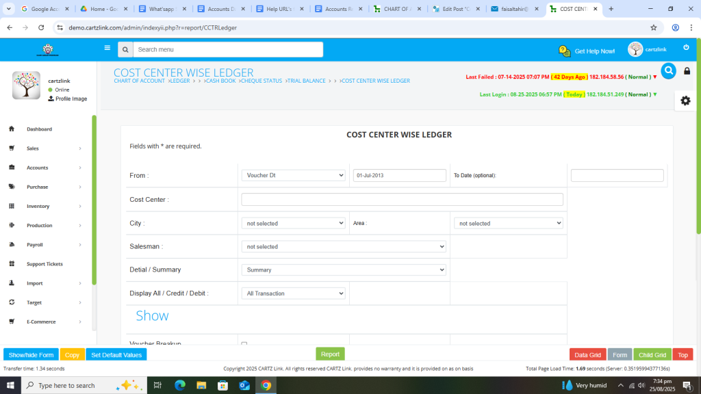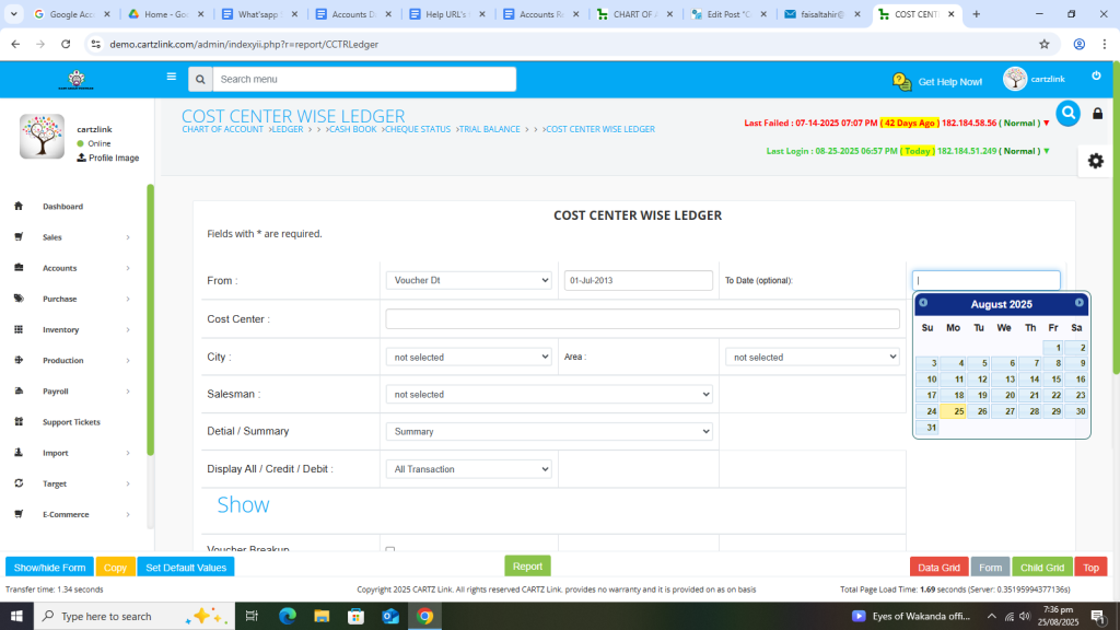 This report displays Cost Center Wise Ledger. Go to Accounts, click on Reports and now click on Cost Center Wise Ledger.