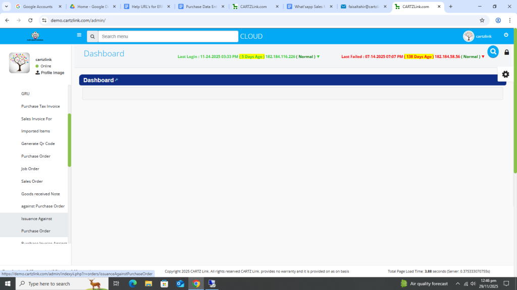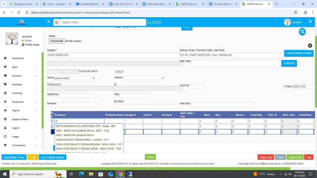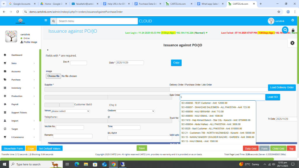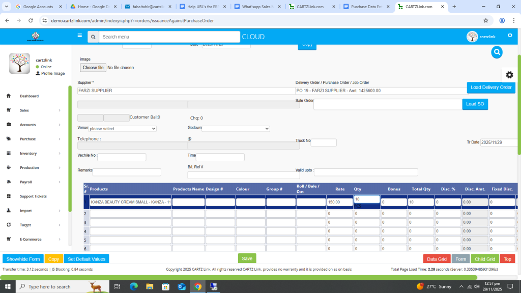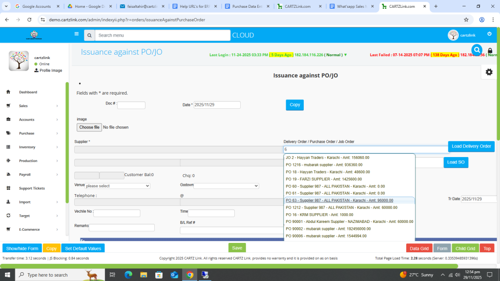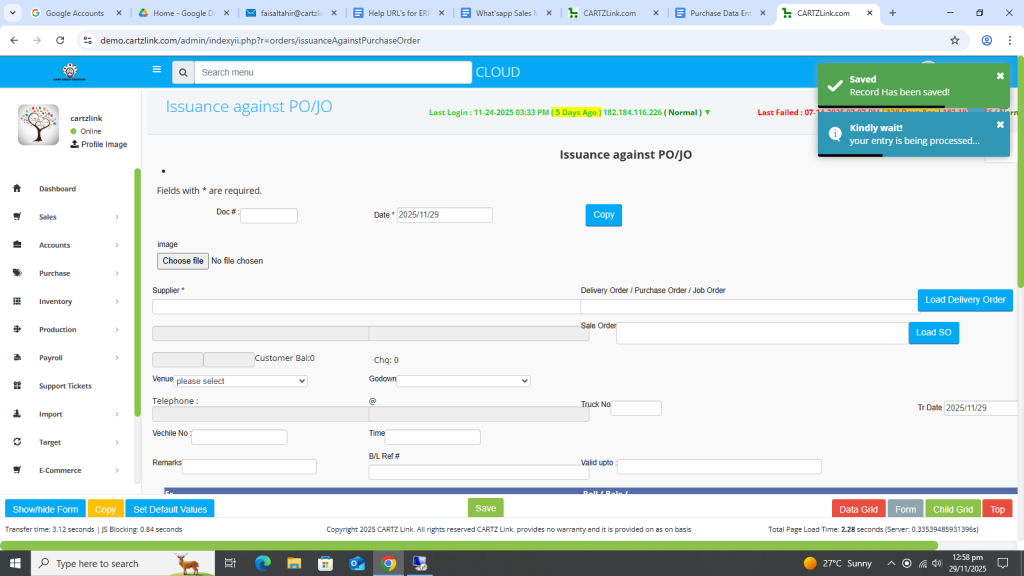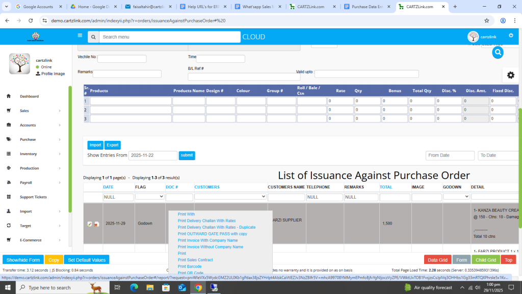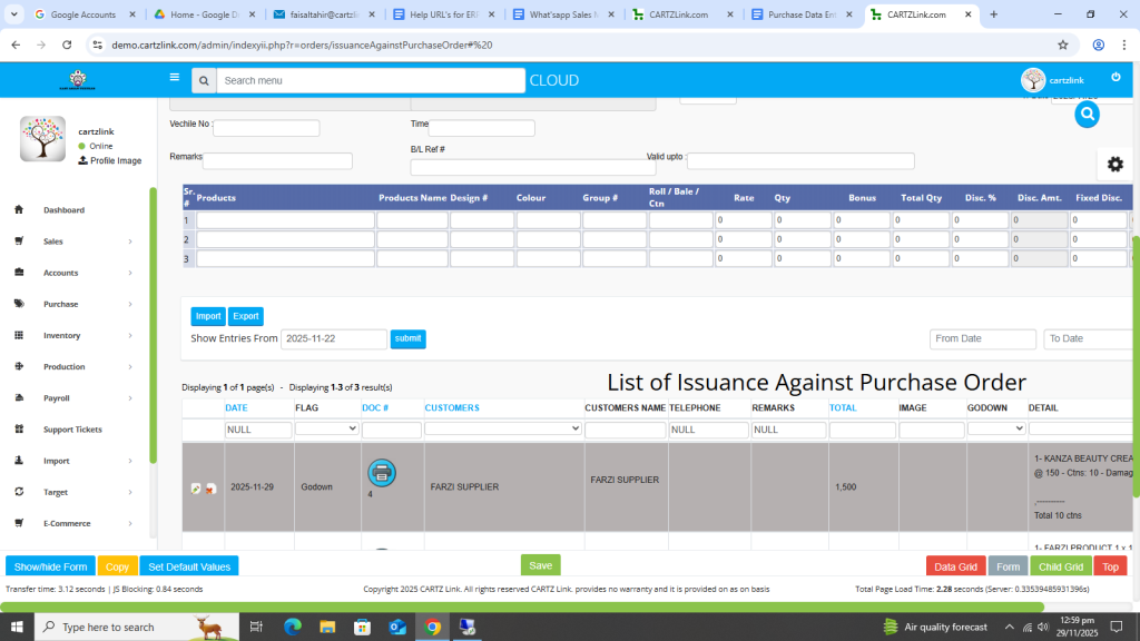 The material against the Purchase Order can be issued through this feature. Go to Purchase, now click on Data Entry and then click on Issuance Against Purchase Order.