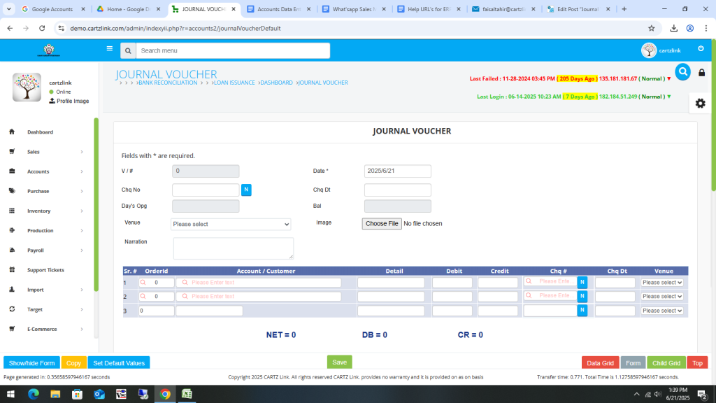 First Go to Accounts, then click on Data Entry and then click on Journal Voucher-Default.