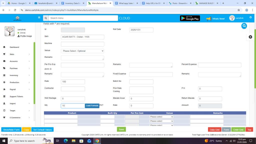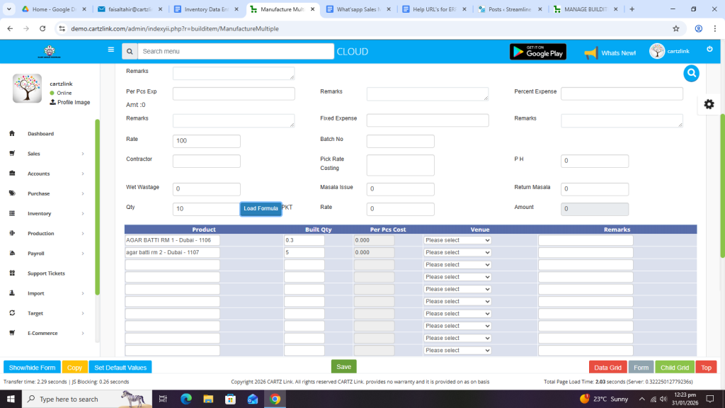First select the product with the Formula available in the system.