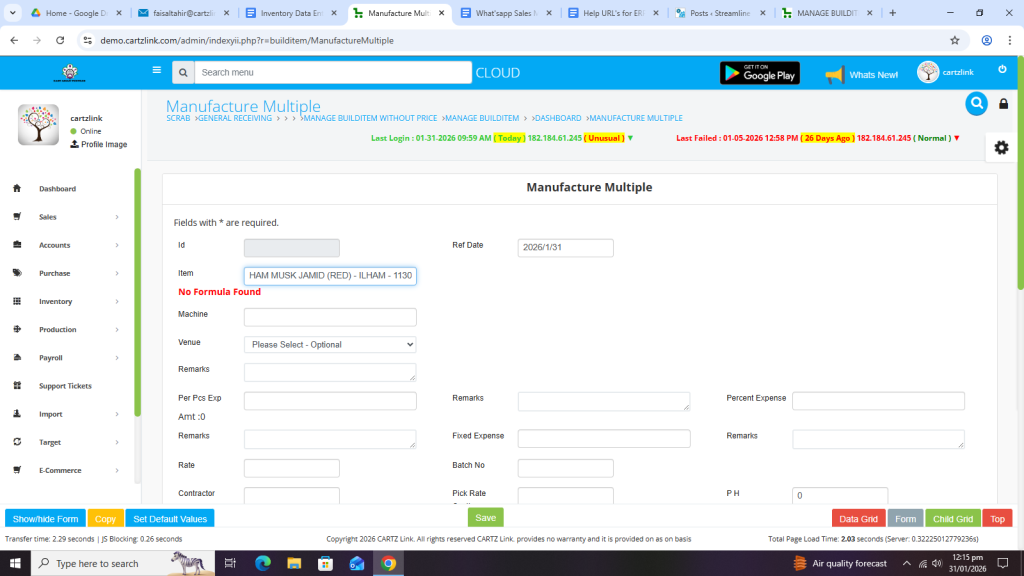 If the product’s formula is not available in the system, then the system will give the error. No Formula Found.
