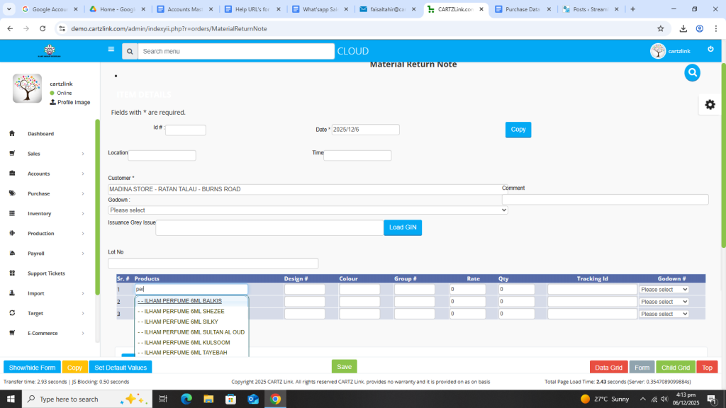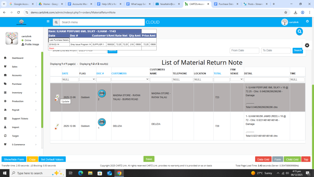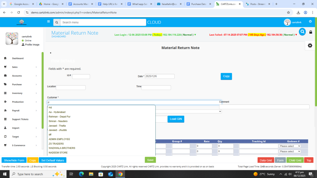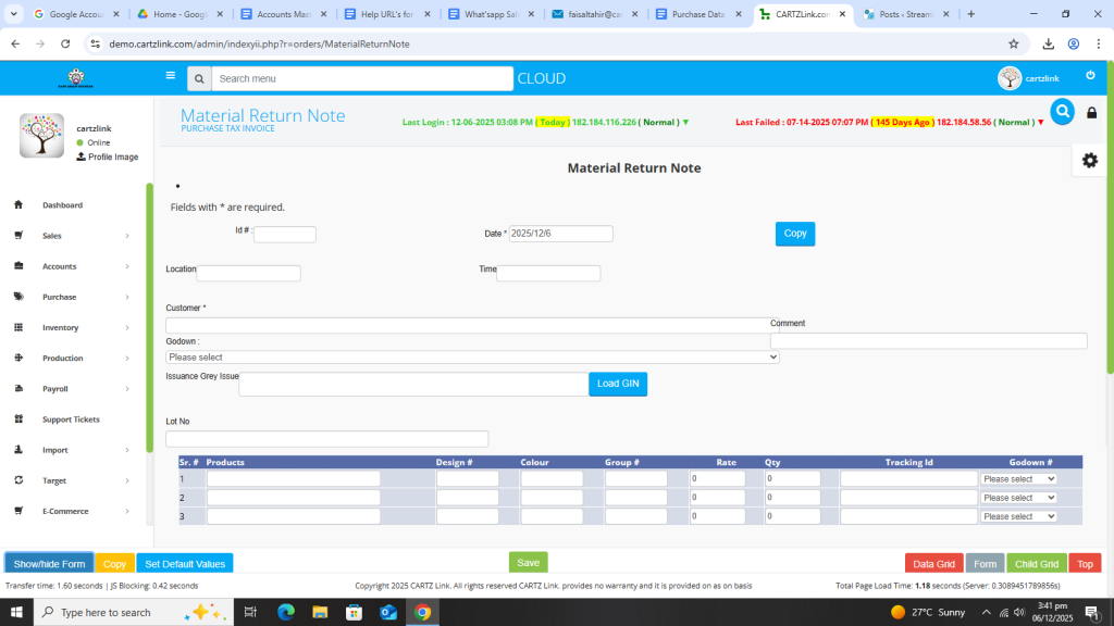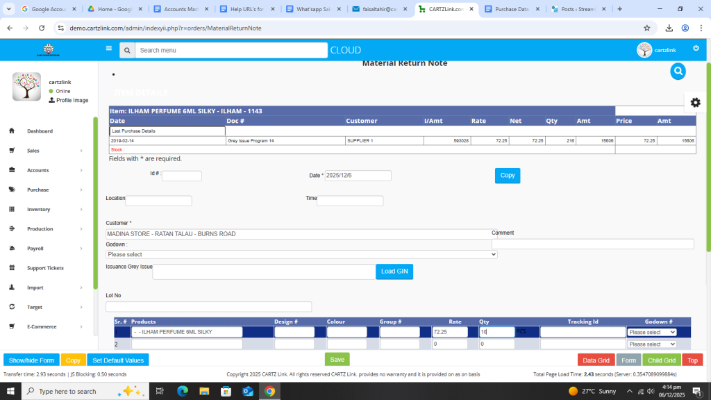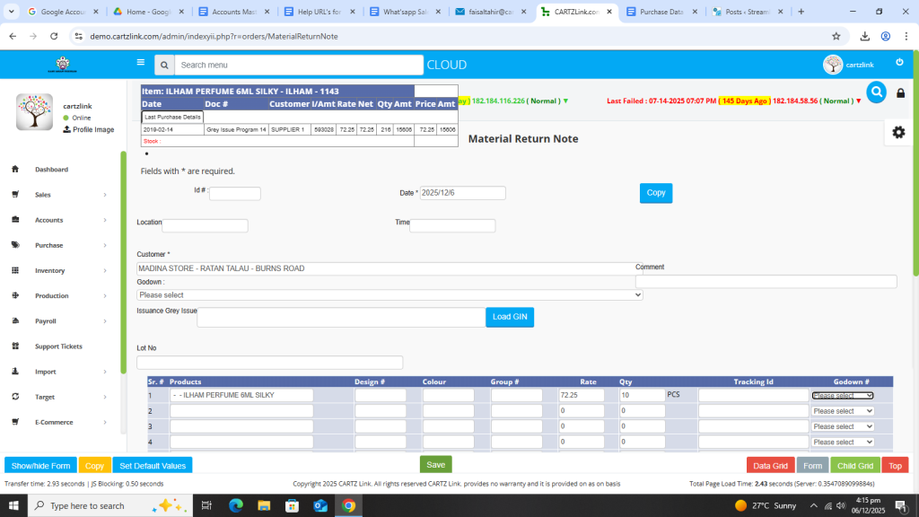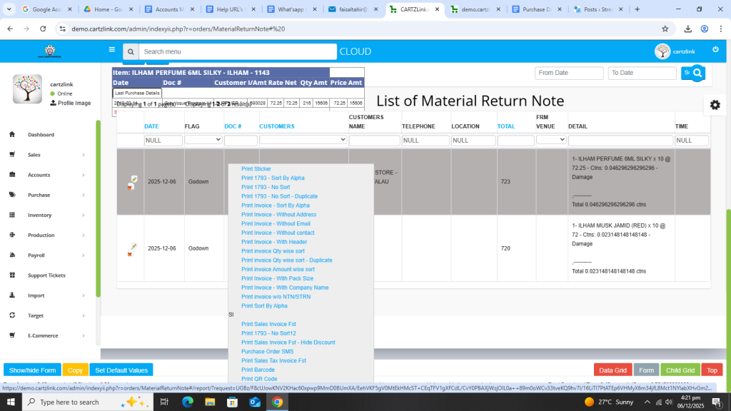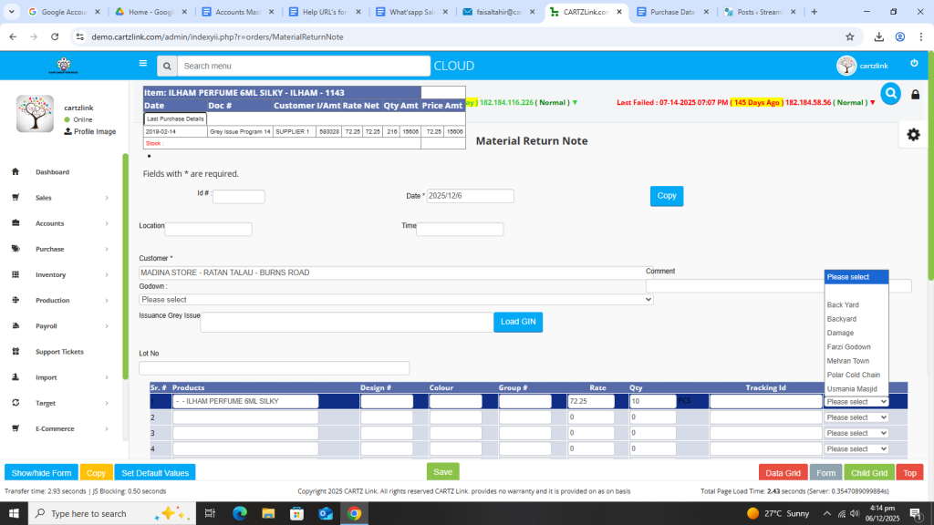 This feature creates Material Return Note against the products. Go to Purchase, then click on Data Entry and now click on Material Return Note.