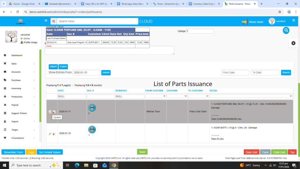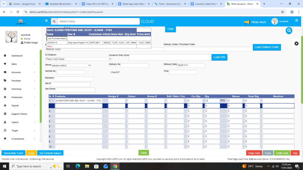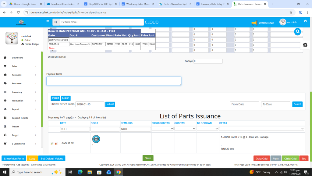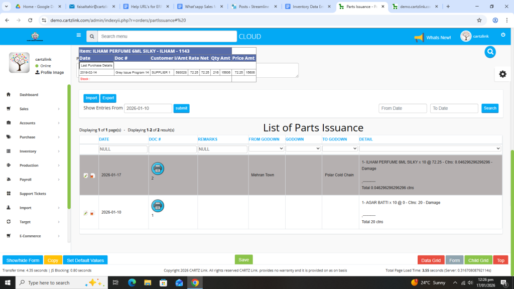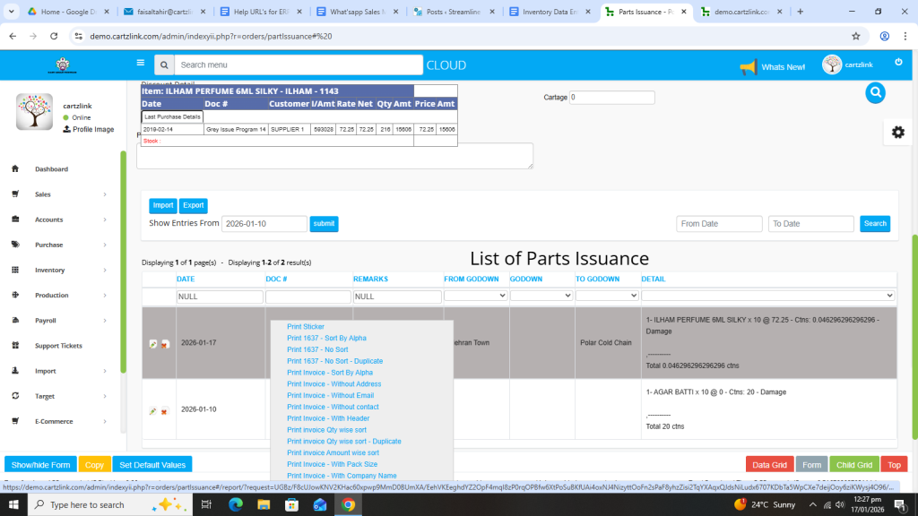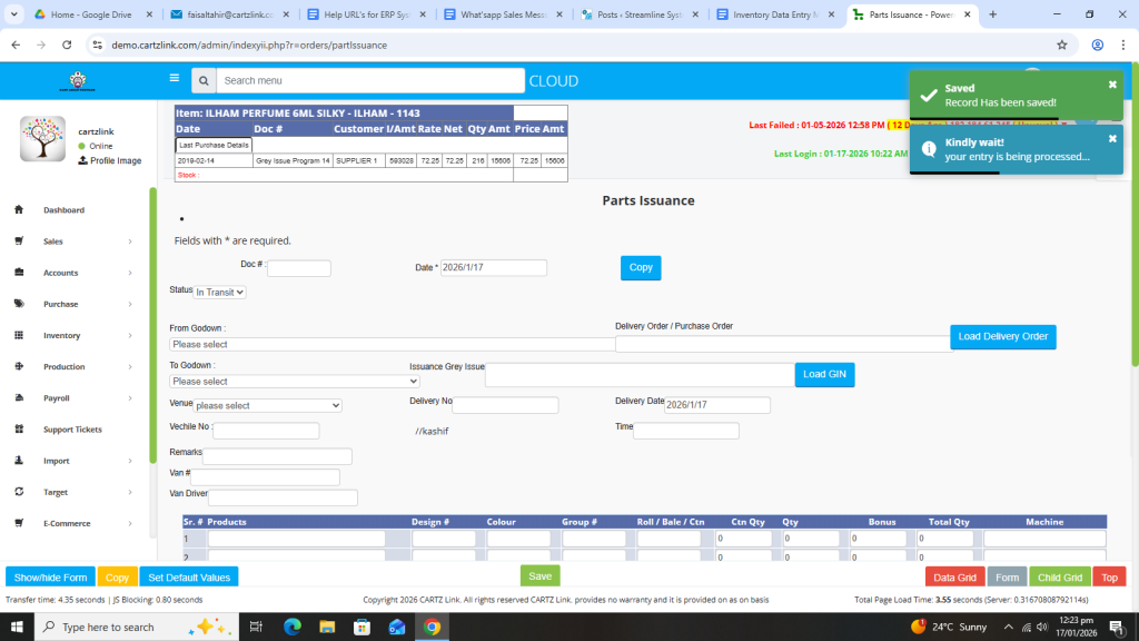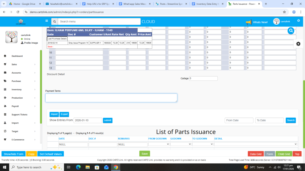 Basically, the feature is used for the issuance of Semi Finished Goods. First click on Inventory, then click on Data Entry and now click on Parts Issuance.