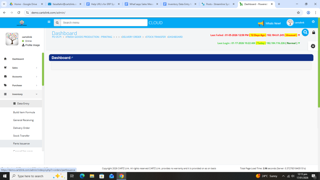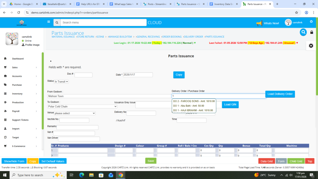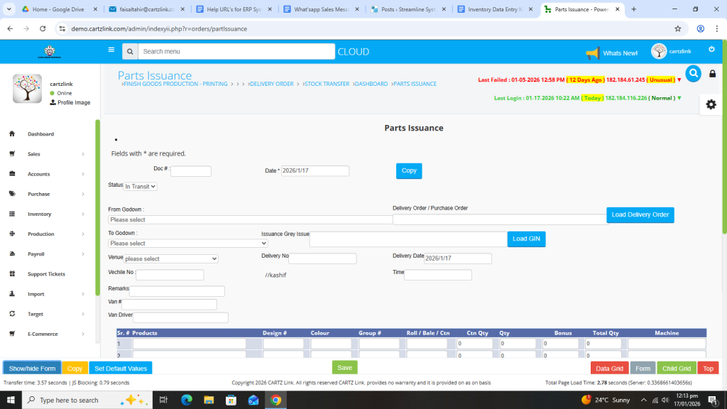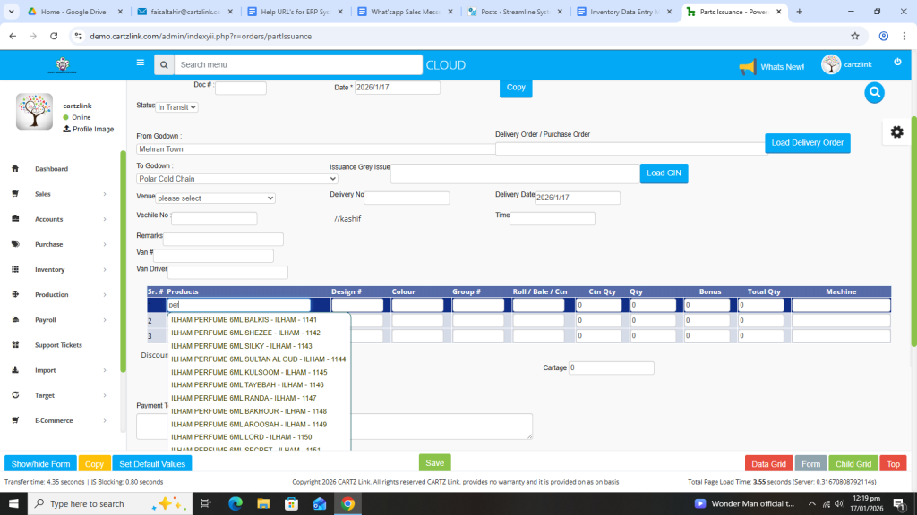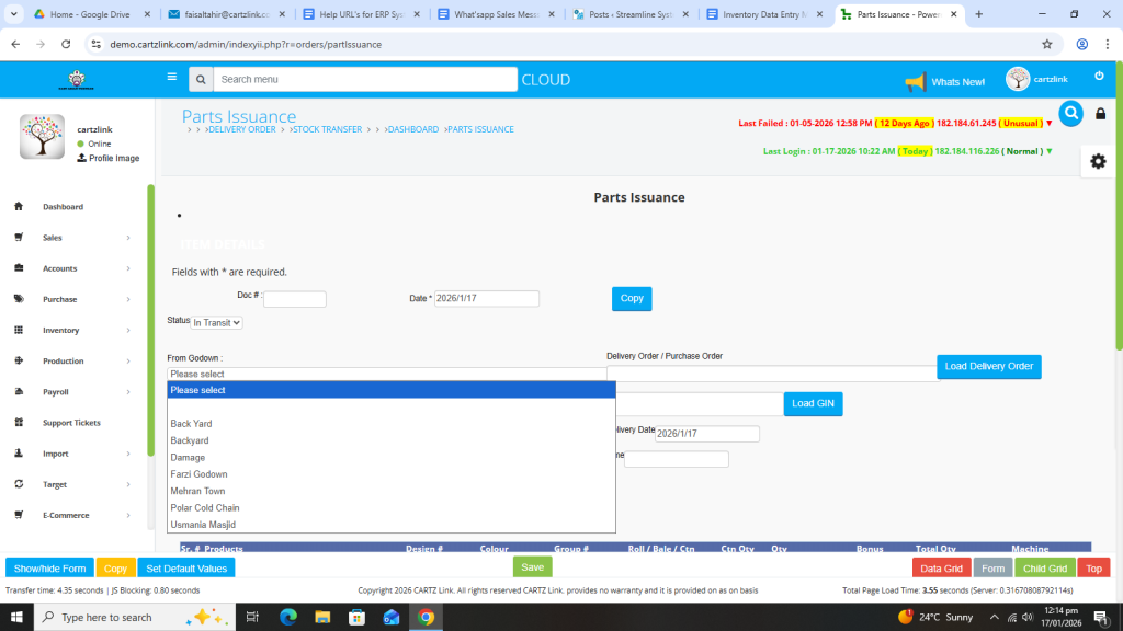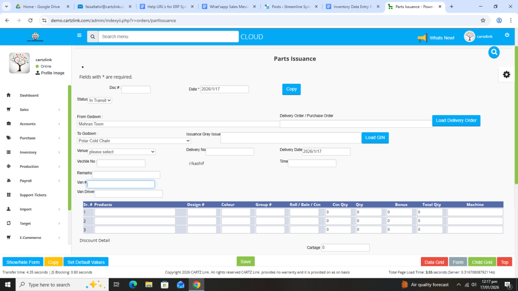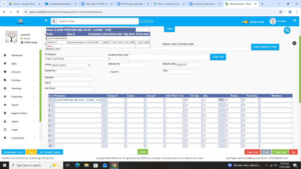 Basically, the feature is used for the issuance of Semi Finished Goods. First click on Inventory, then click on Data Entry and now click on Parts Issuance.