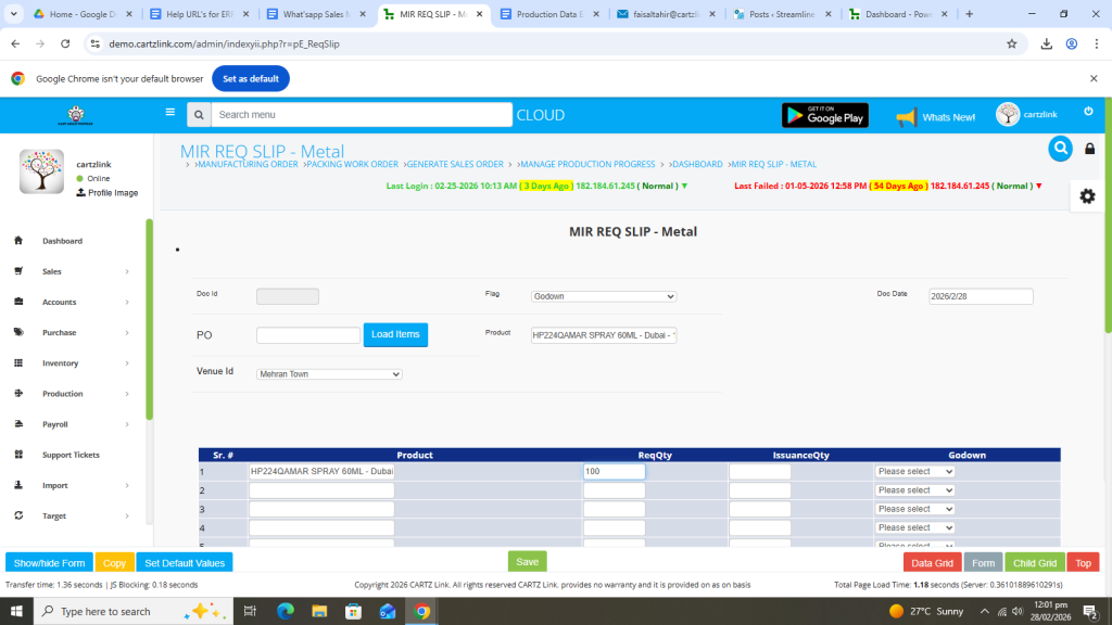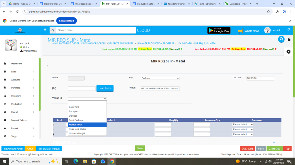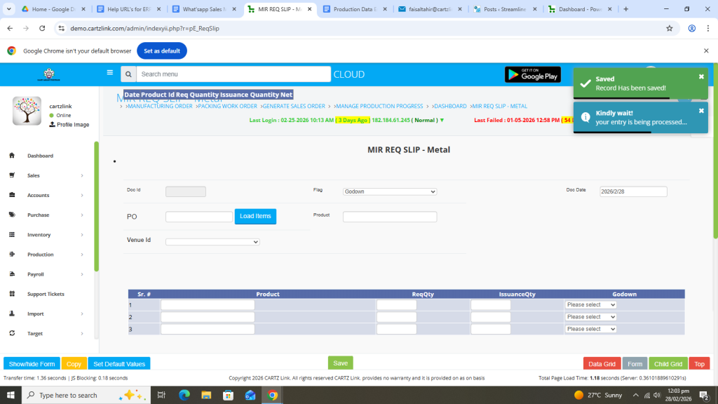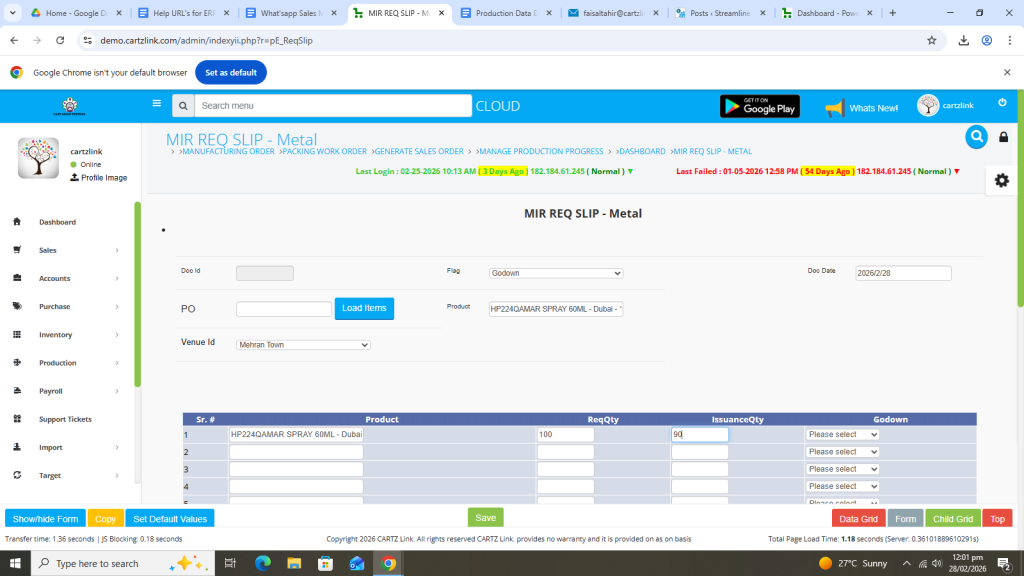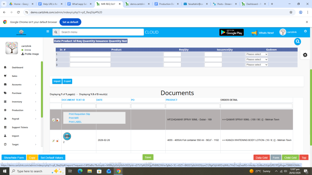 First click on Production, then click Data Entry and now click on Requisition Slip.